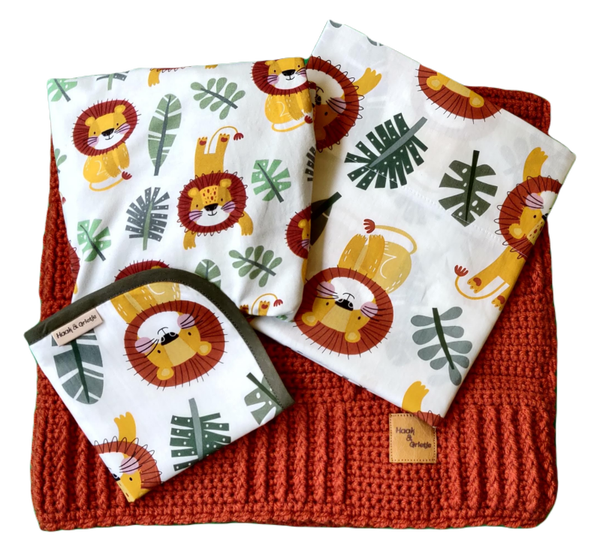 - spuugdoekje, ene kant katoen, andere kant hydrofiel, 30 x 30 cm.