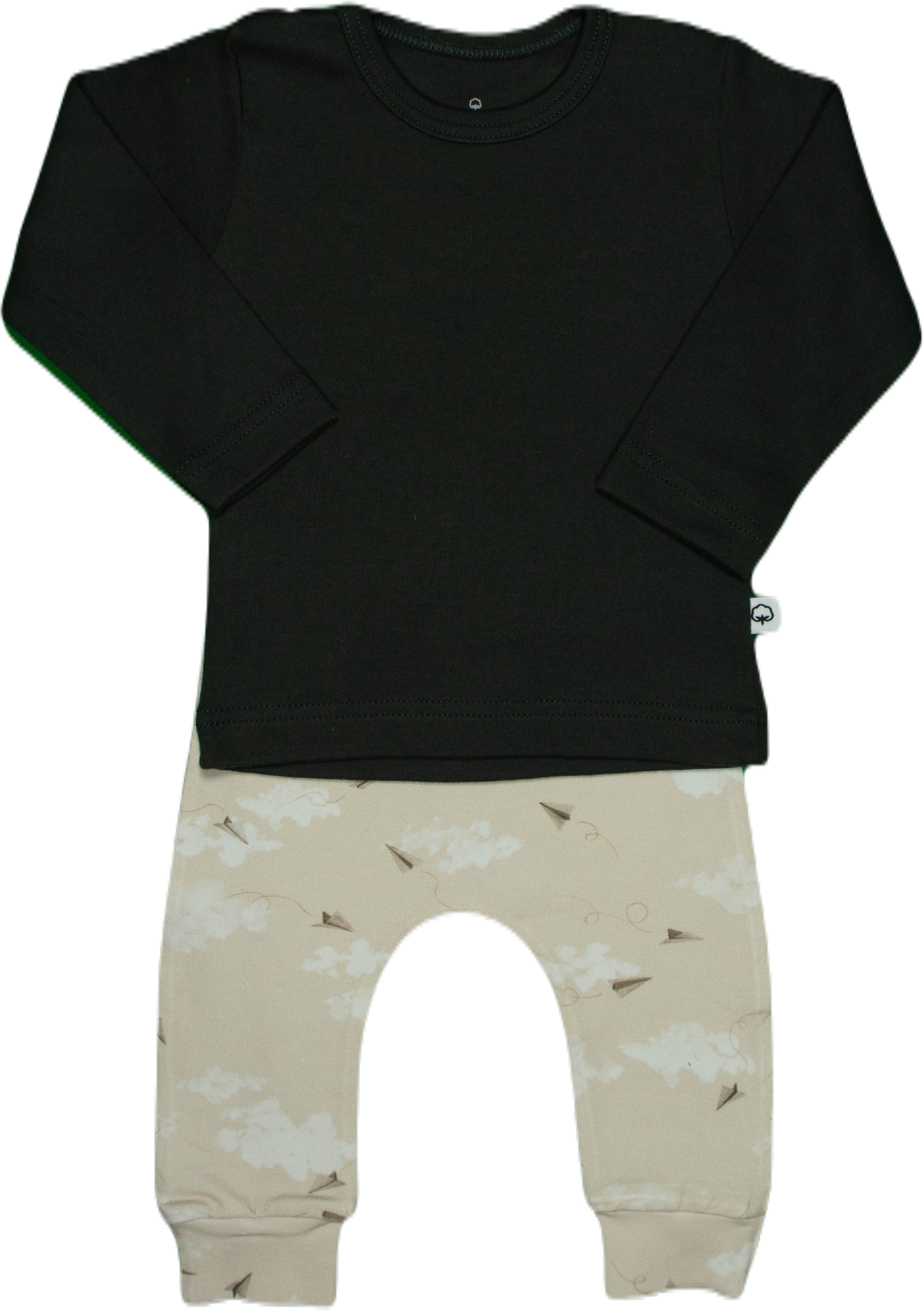 Een licht beige broekje waar de gevouwen vliegtuigen heerlijk op rondvliegen.