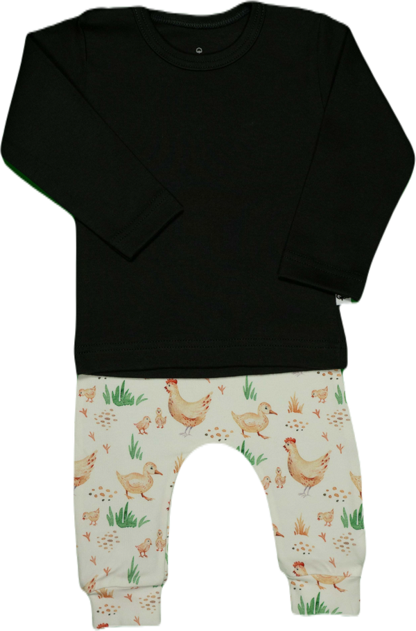 Vrolijk broekje met scharrelende kippen en kuikentjes erop.