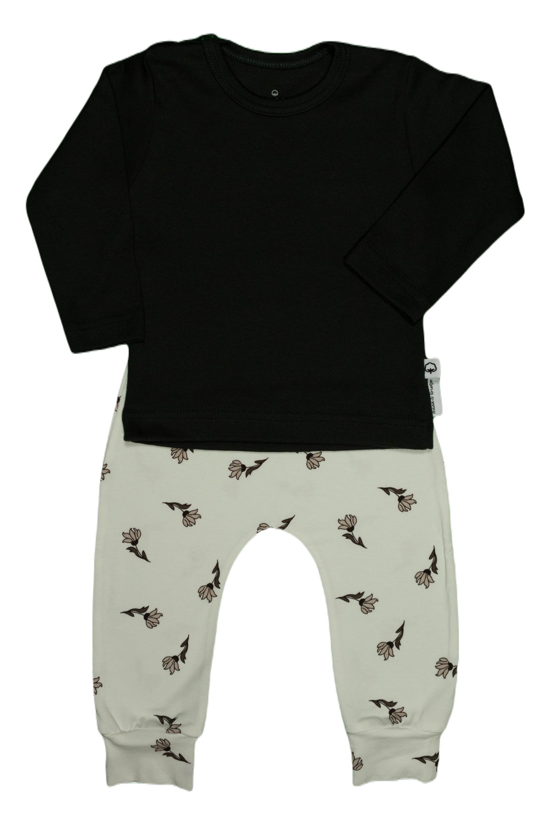 Ondergrond is off white en de bloemen zijn taupekleurig met bruin gekleurde stelen en bladeren.