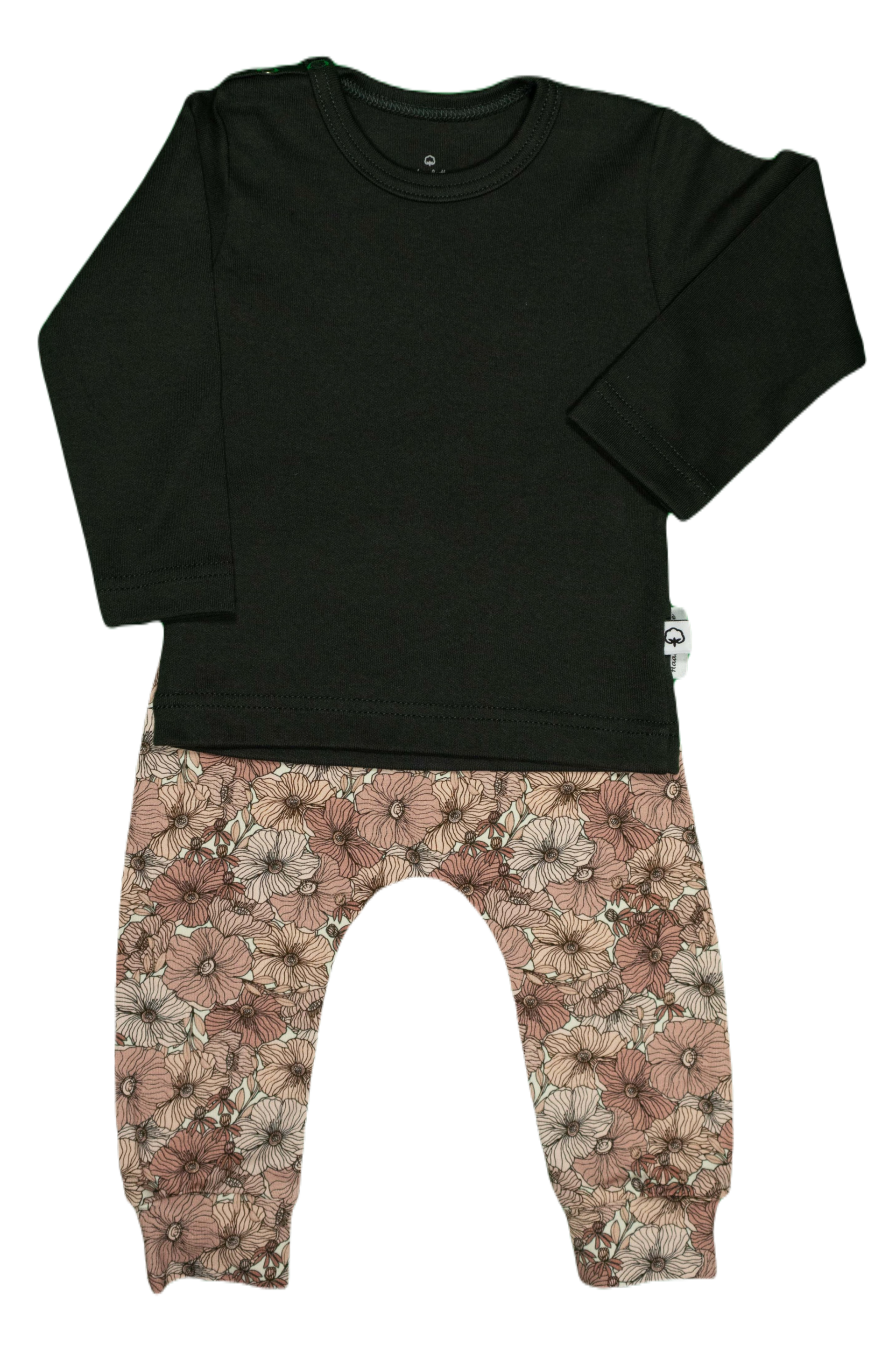 Een broekje in vele gekleurde roze bloesembloemen.