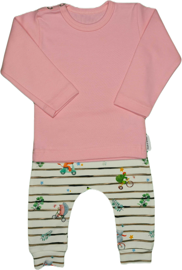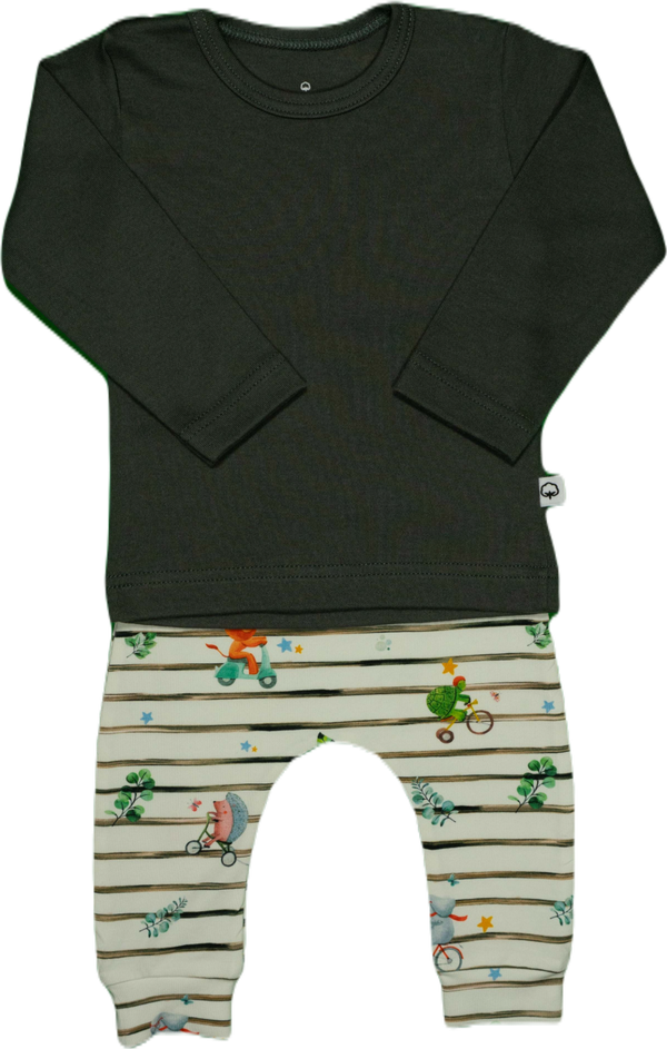 Een vrolijk off white broekje met bruin gekleurde strepen erop.