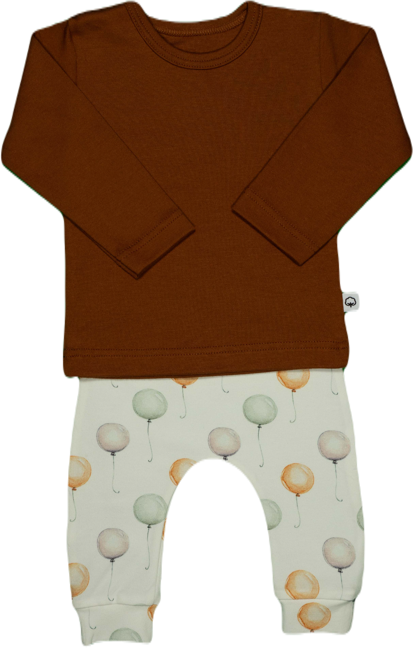 Een vrolijk broekje, off white, vol met grijs, roestbruin en grijsgroene ballonnen.