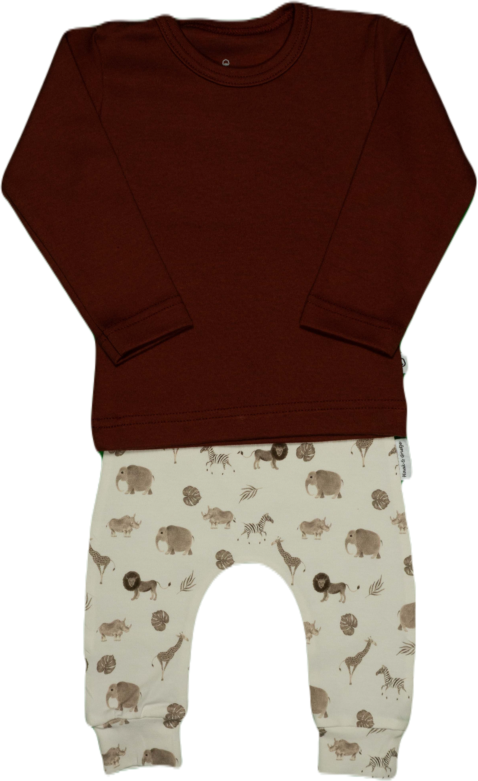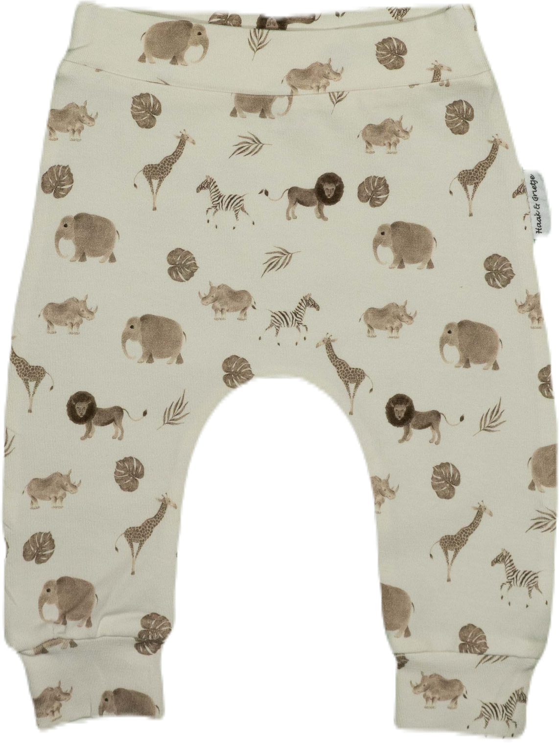 Een offwhite broekje bezaaid met vrolijke dieren uit de jungle.