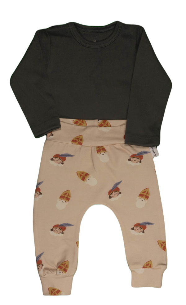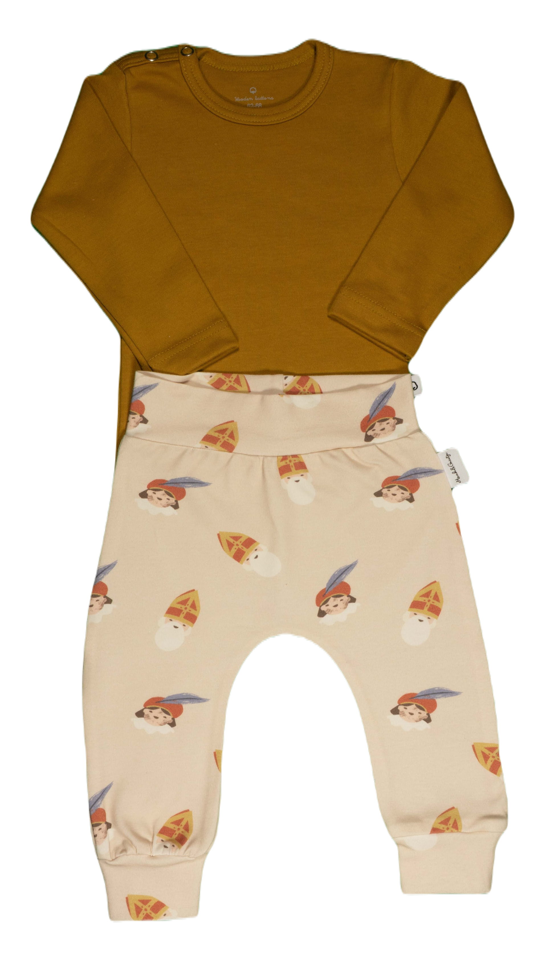 Een ivoorkleurig broekje met de portretten van Sint en Piet erop.
