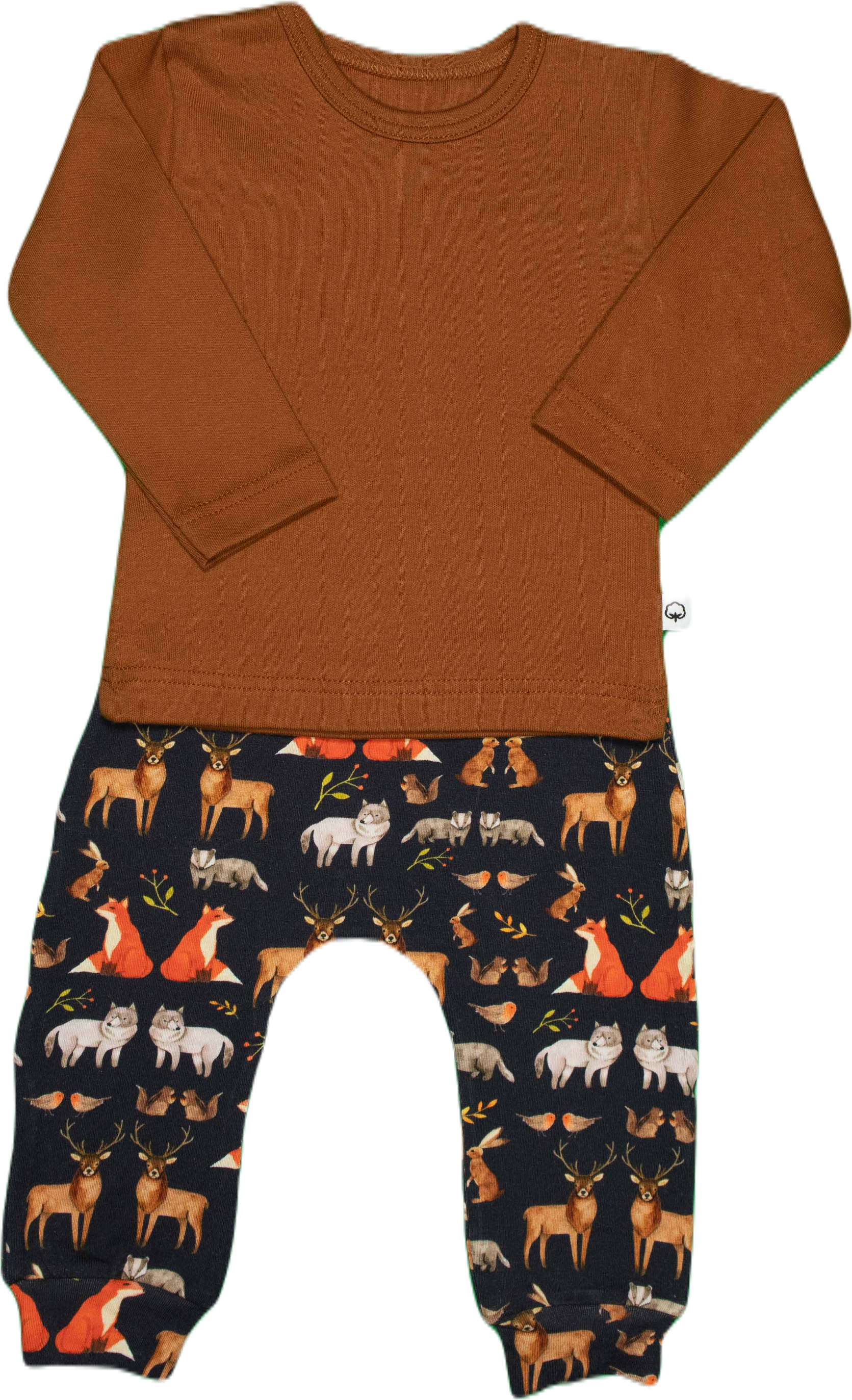 Alle bosdieren staan op dit broekje: das, haas, roodborstje, edelhert, eekhoorn, wolf en de vos.