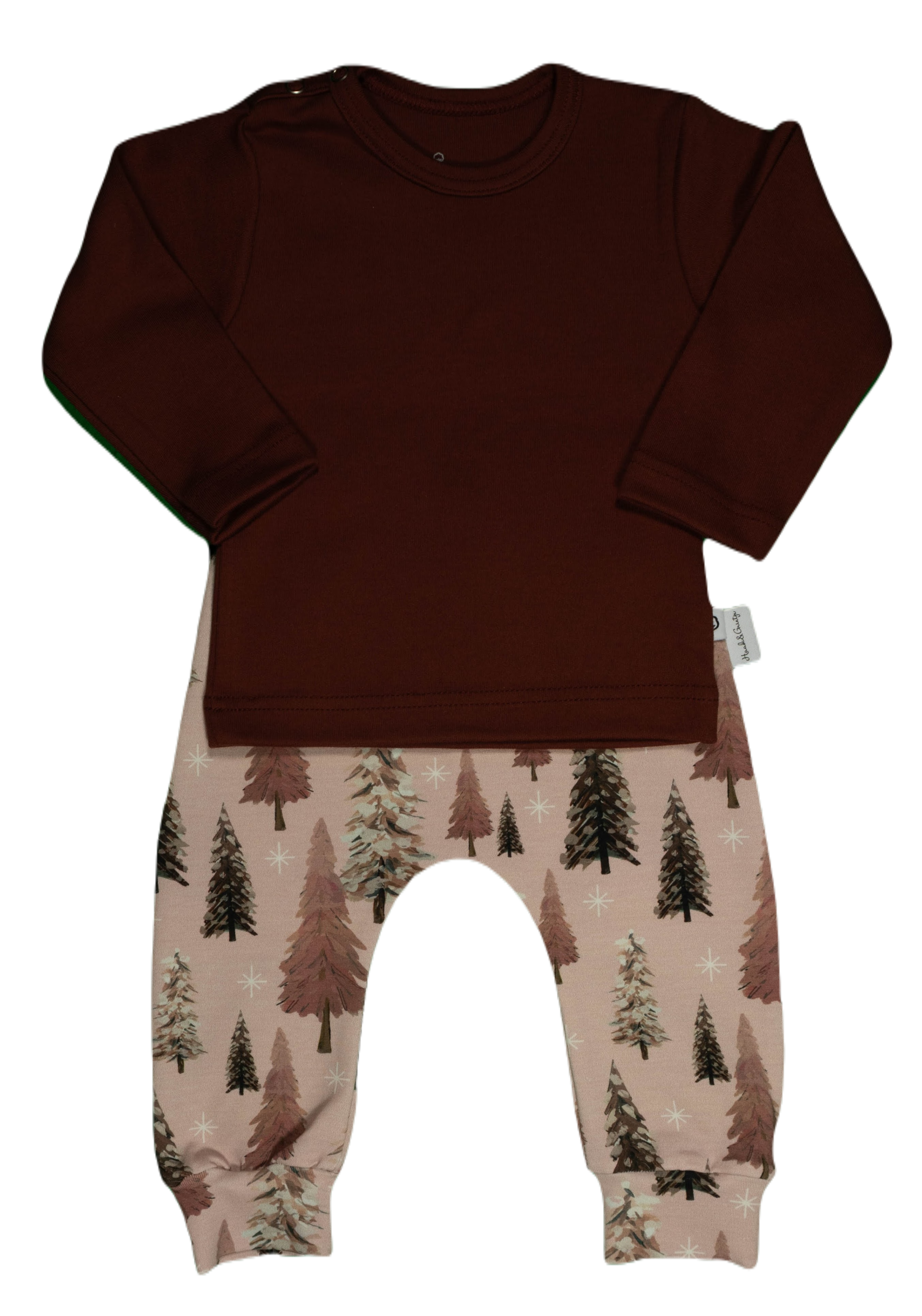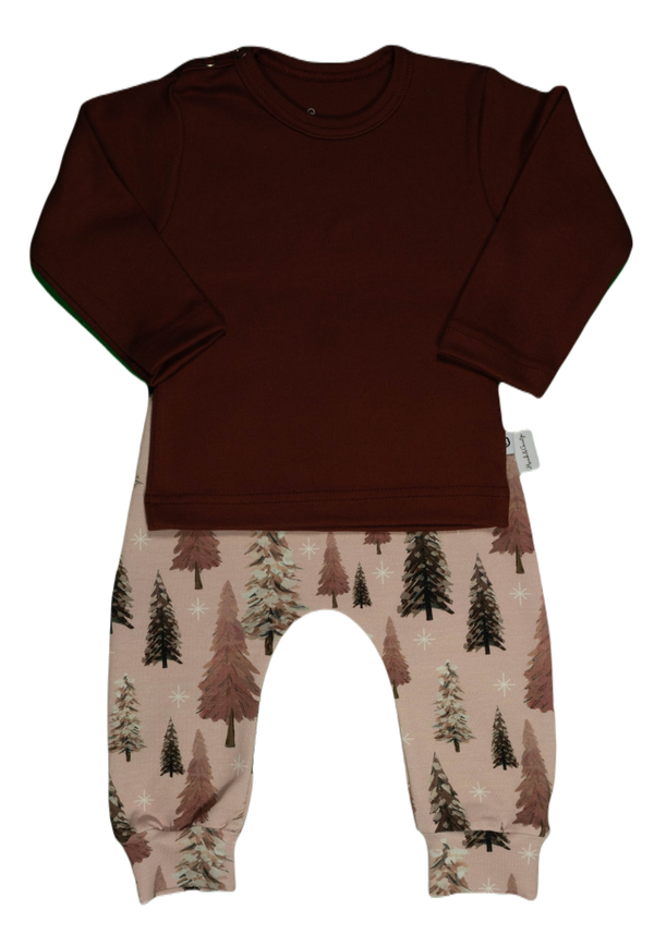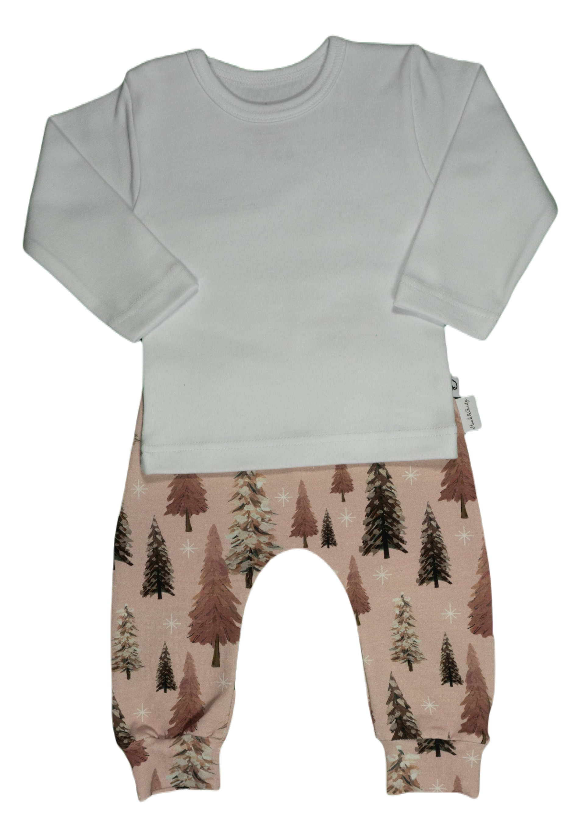 Op een oud roze ondergrond staan de bomen in een winters bos.