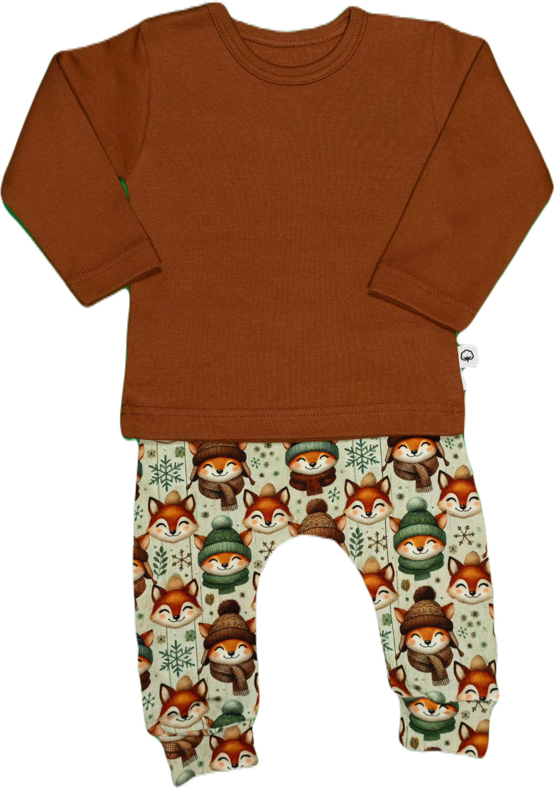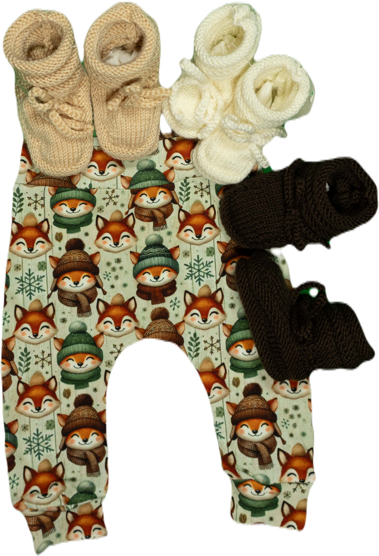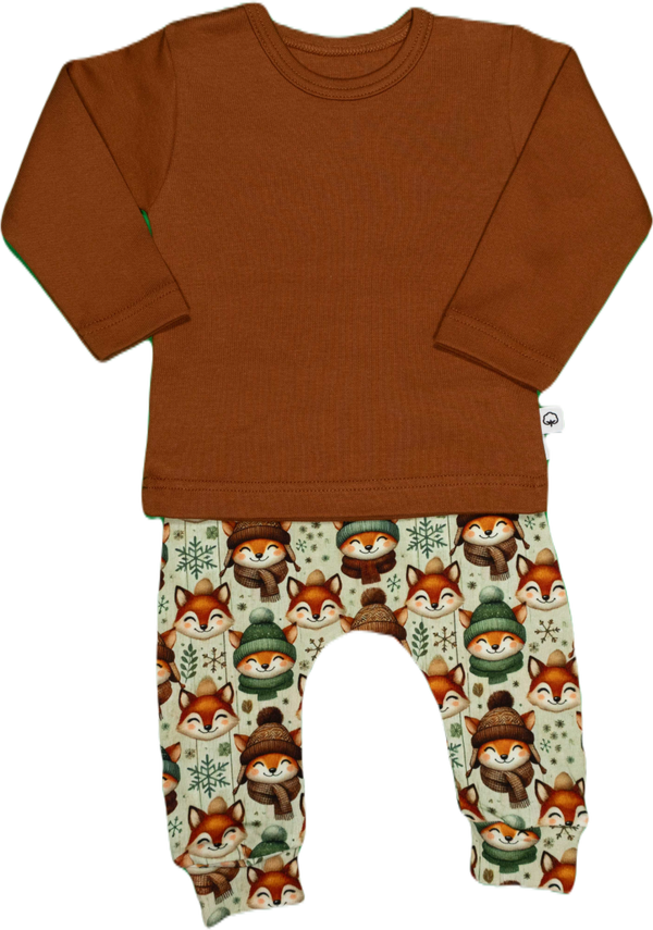 Een vrolijk broekje met vosjes erop die lekker warm zijn aangekleed.