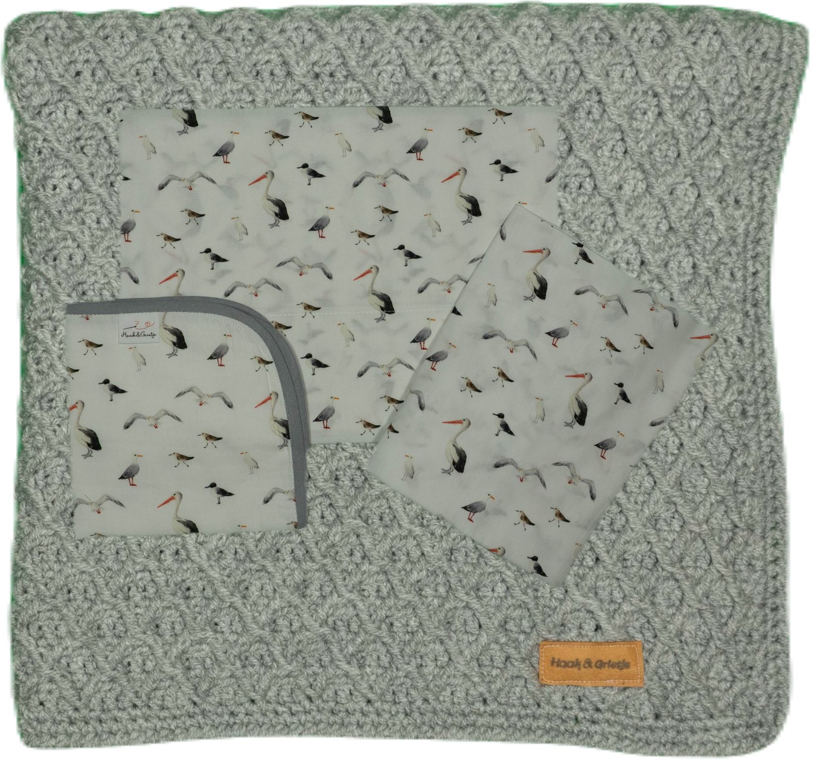 Handgehaakte deken in lichtgrijs. Het ruitjes motief is in een reliëfsteek gehaakt