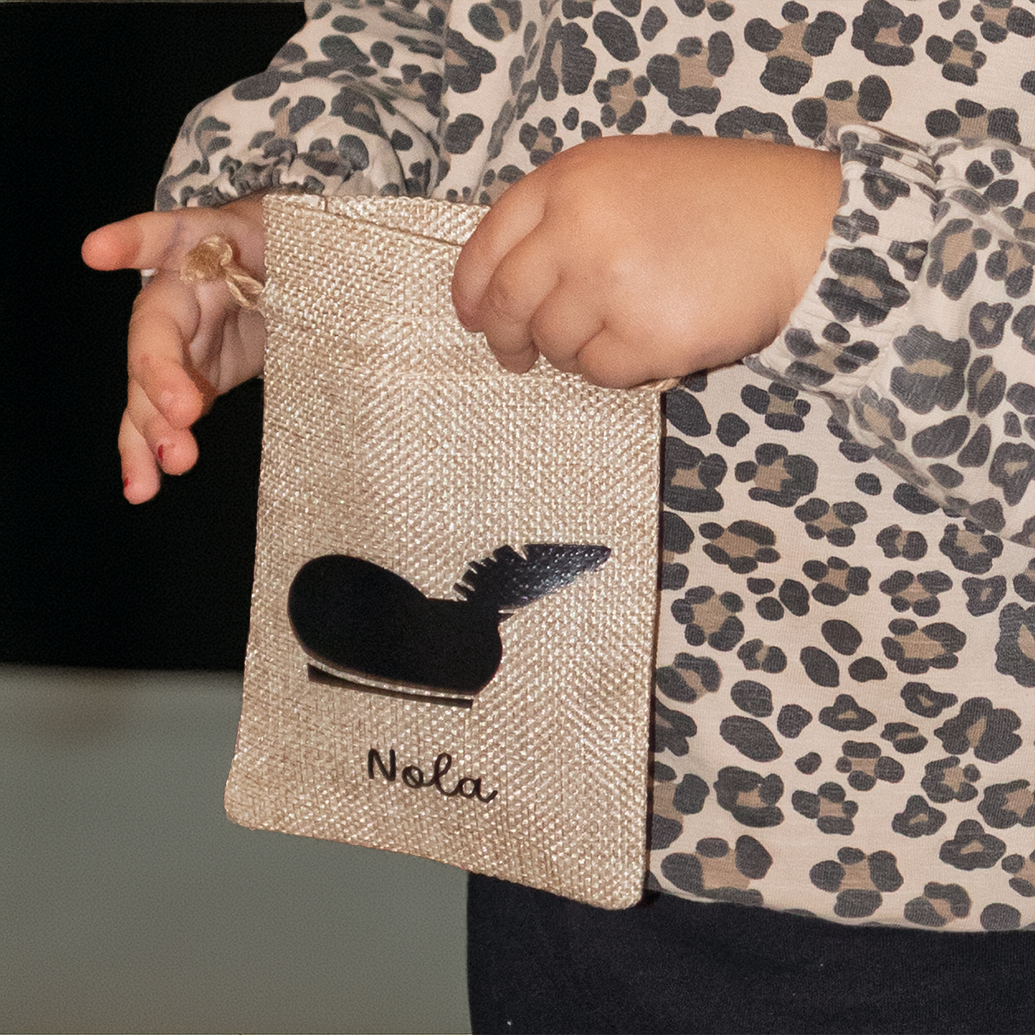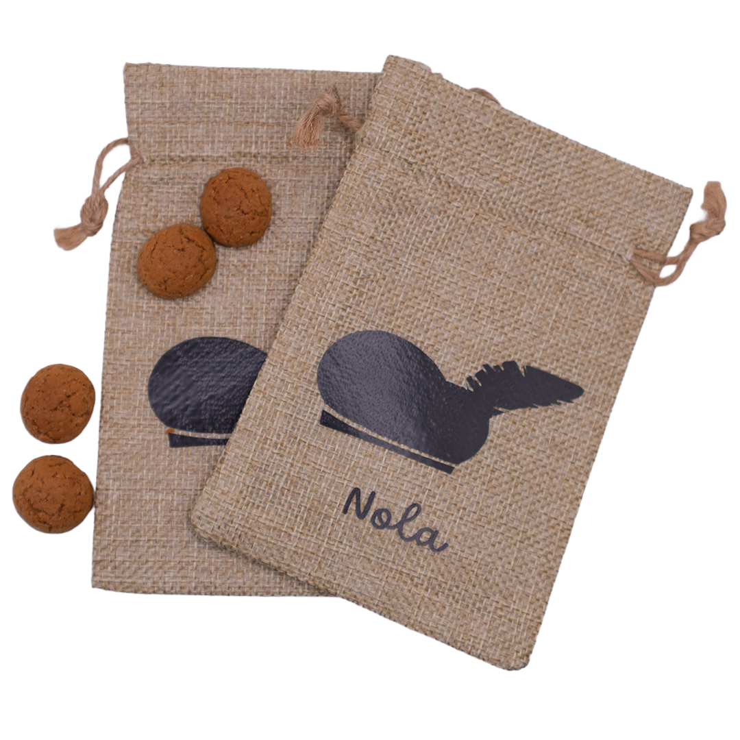 Een jute pepernotenzakje bedrukt met een pietenmuts en de naam van het kind.