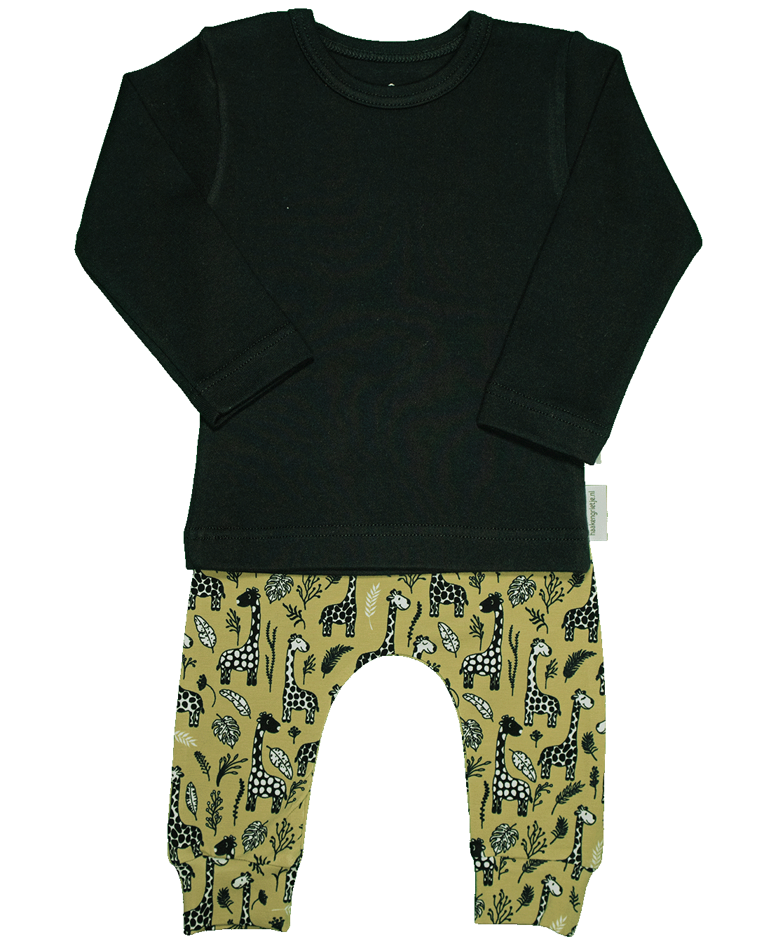 Een vrolijk broelkje vol met zwart-wit giraffen. Kan ook met bijpassend shirtje!
